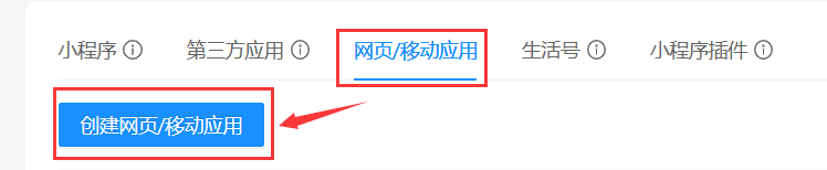 2、进入控制台页面后,在下面【网页、移动应用】选项卡点开,创建应用