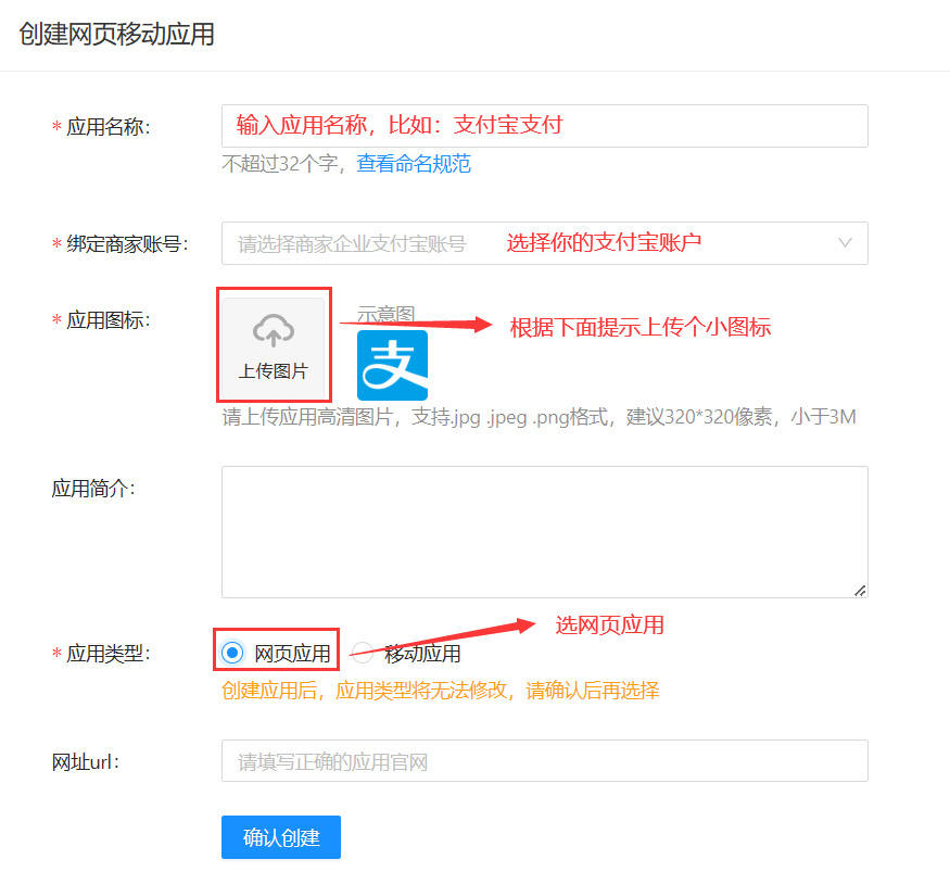 进入应用创建页面,详细参数填写看下图: