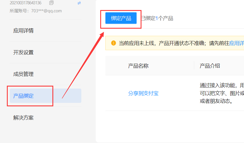 应用申请后,需要绑定【当面付】和【手机网站支付】产品,进入申请好的应用详情页面,找到【产品绑定】页面设置,如图示页面