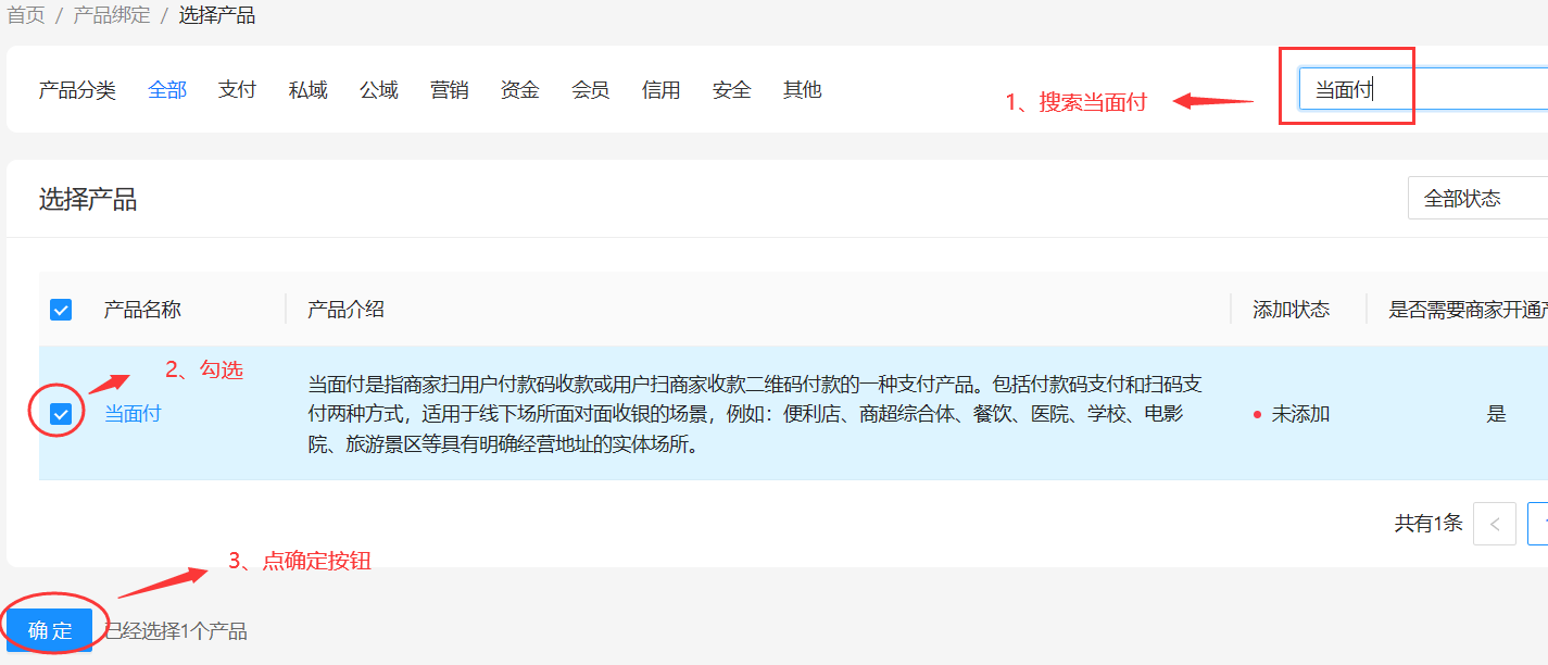 点击【绑定产品】链接,在列表右上角搜索:当面付,并完成产品添加(手机网站支付添加方法相同)