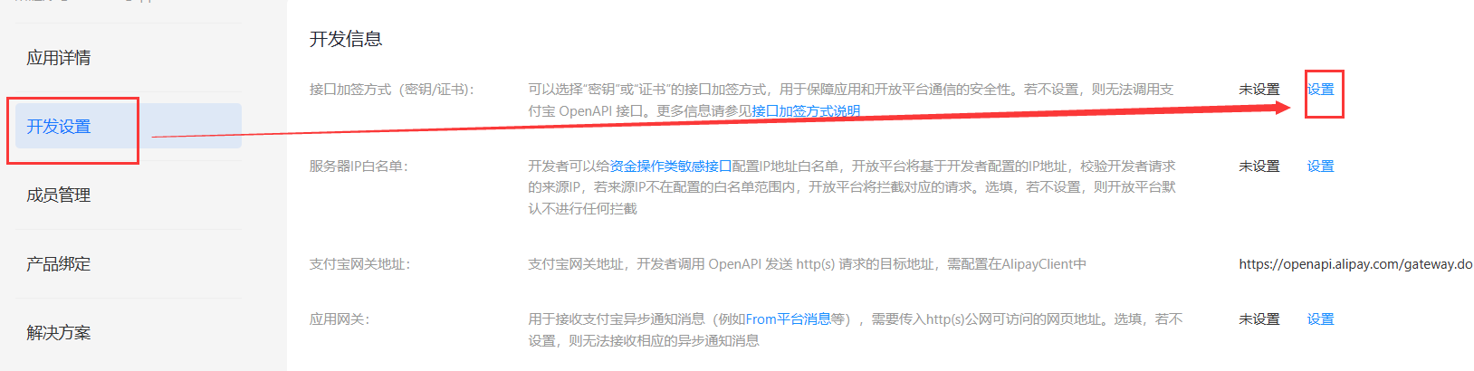1、应用申请后,需要设置应用的加签方式,进入申请好的应用详情页面,找到【开发设置】页面设置,如图示页面