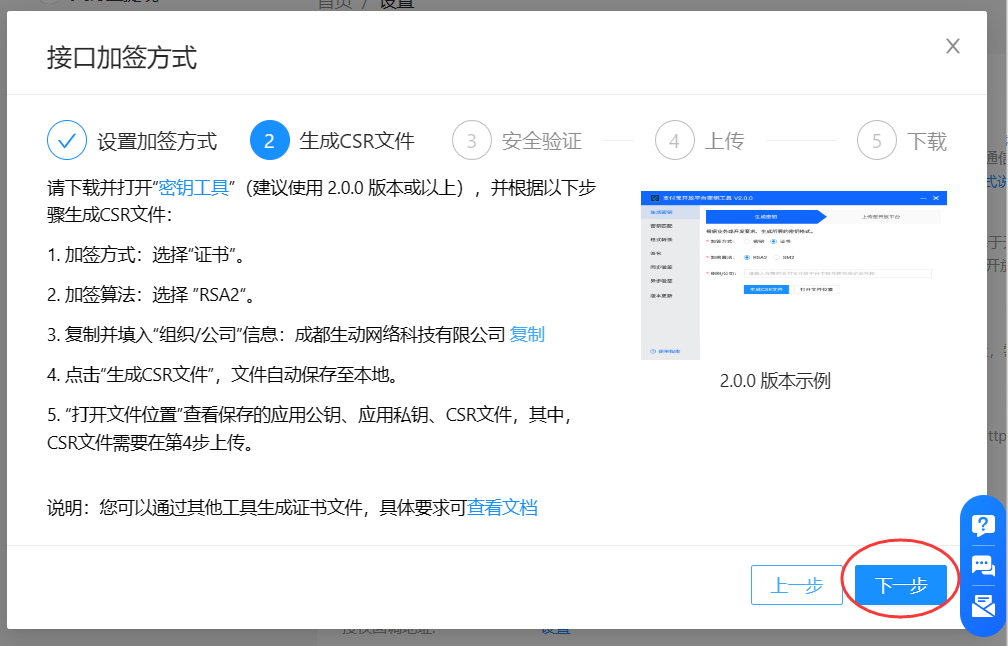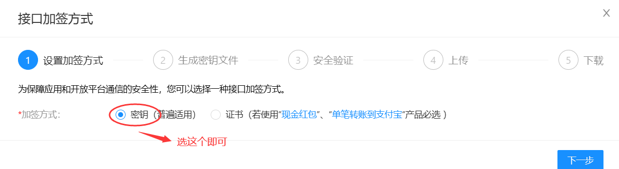 点击【设置】,弹出对话框,选择加签方式为:【密钥】,如下图: