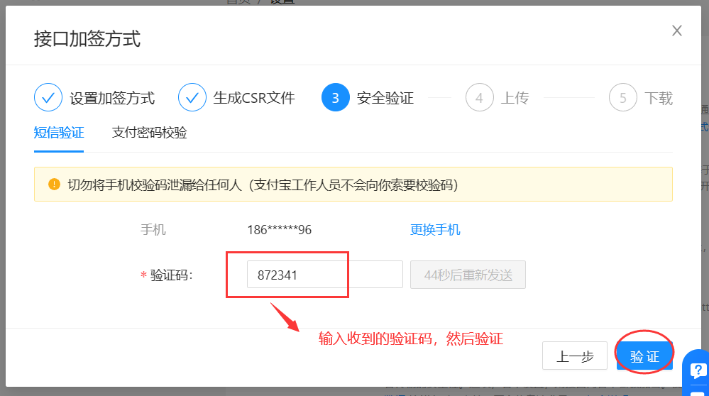 2、返回支付宝开放平台配置页面,点下一步,验证手机短信: