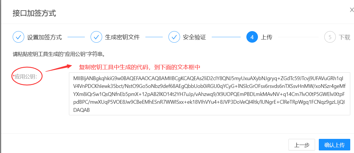 点验证后,并继续,将刚才密钥工具生成的【应用公钥】中的代码复制到界面上,如下图:
