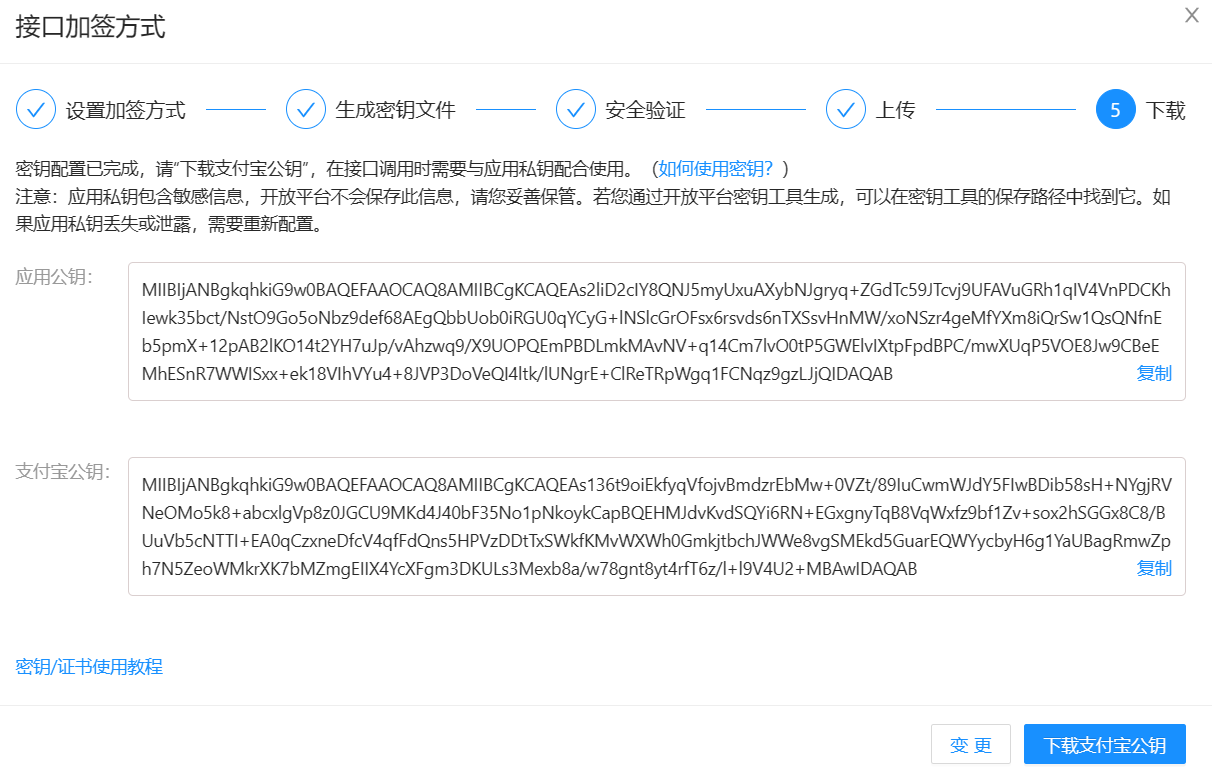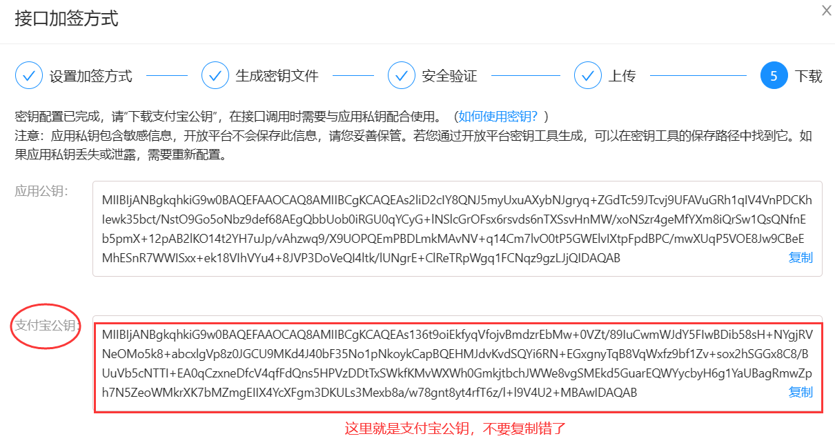 点击【确认上传】后,可以获得生成的【支付宝公钥】,后续网站中需要使用,请不要关闭网页,如下图: